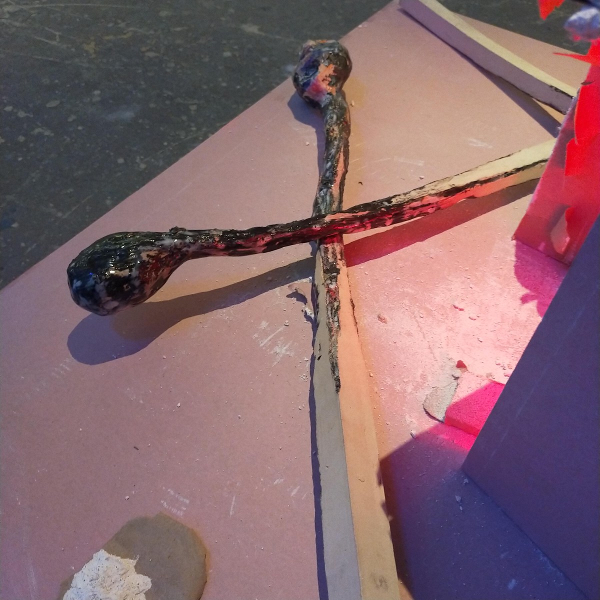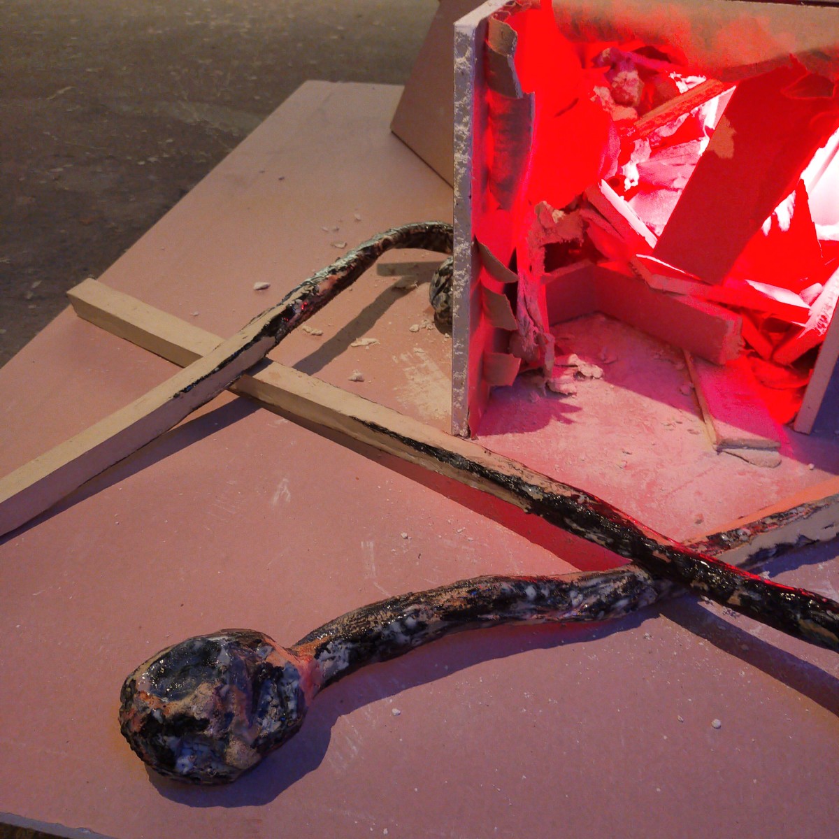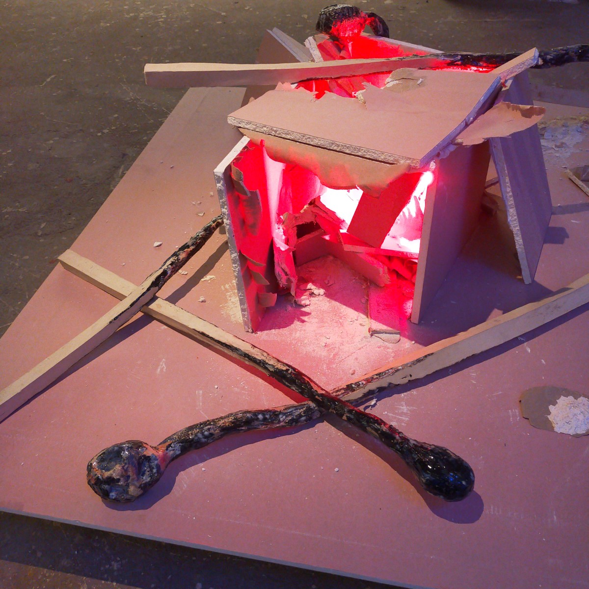 Grès coloré, émaillé haute température; 20 x 15 x 90cm max l'allumette, Installation à dimension variable, placoplâtre inhifugé, lumière rouge. Le peuplier est utilisé pour la fabrication de l'allumette, il provient de la «populi culture». «C’est Normal» est un pied de nez étrange, lucide. titre directement inspiré de la musique de Brigitte Fontaine et Areski.