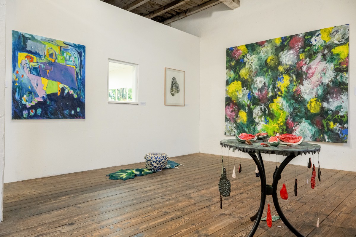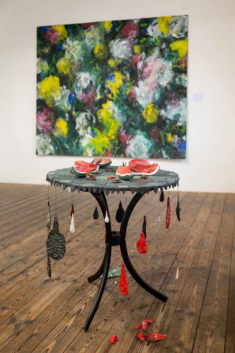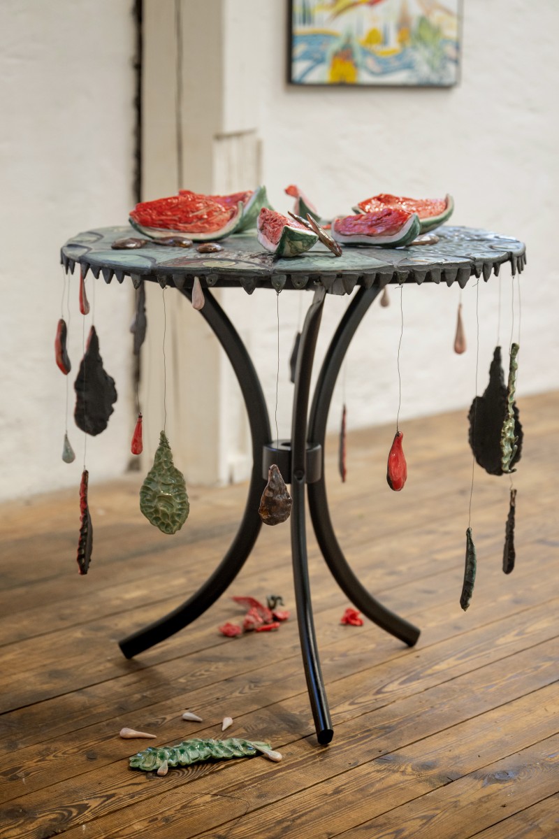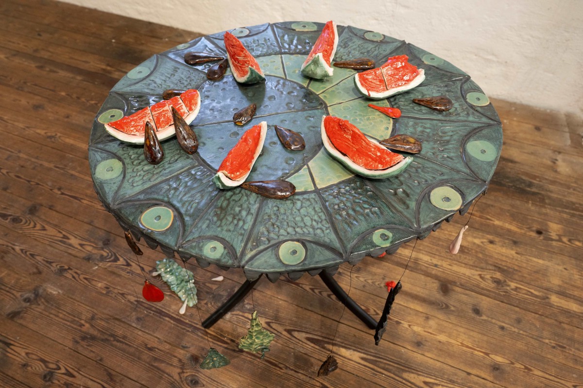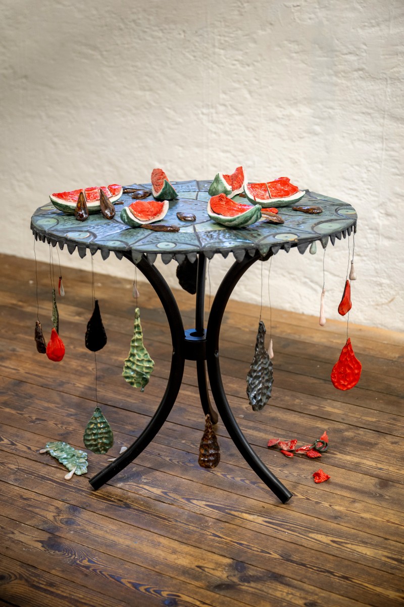 BALANCE AND WATERMELONS Category: installation Year: 2025 Balance and watermelons, 2025, Pelisson LisaCeramique émaillées, mosaique, metal,90-x-90-x80-cmCry-ing for palestine,credits photographiques Pierre Rich