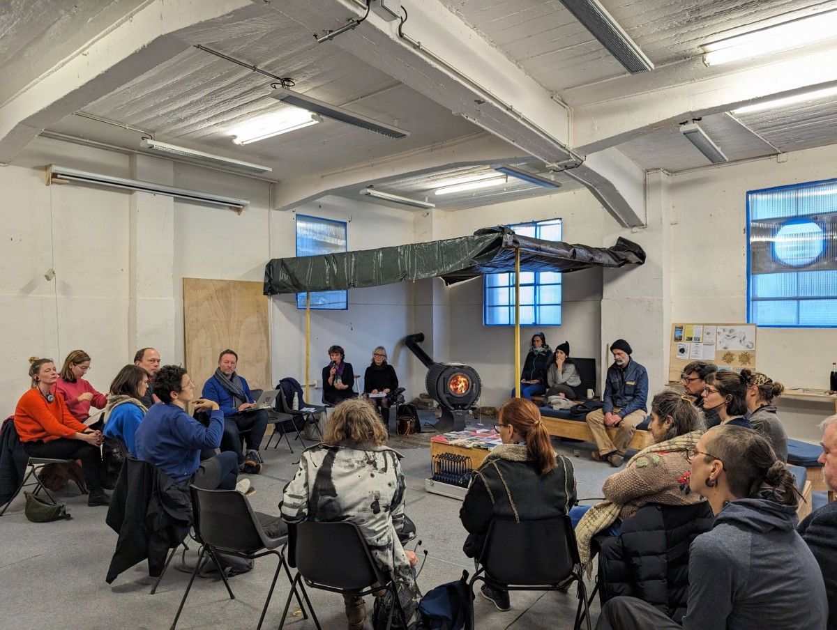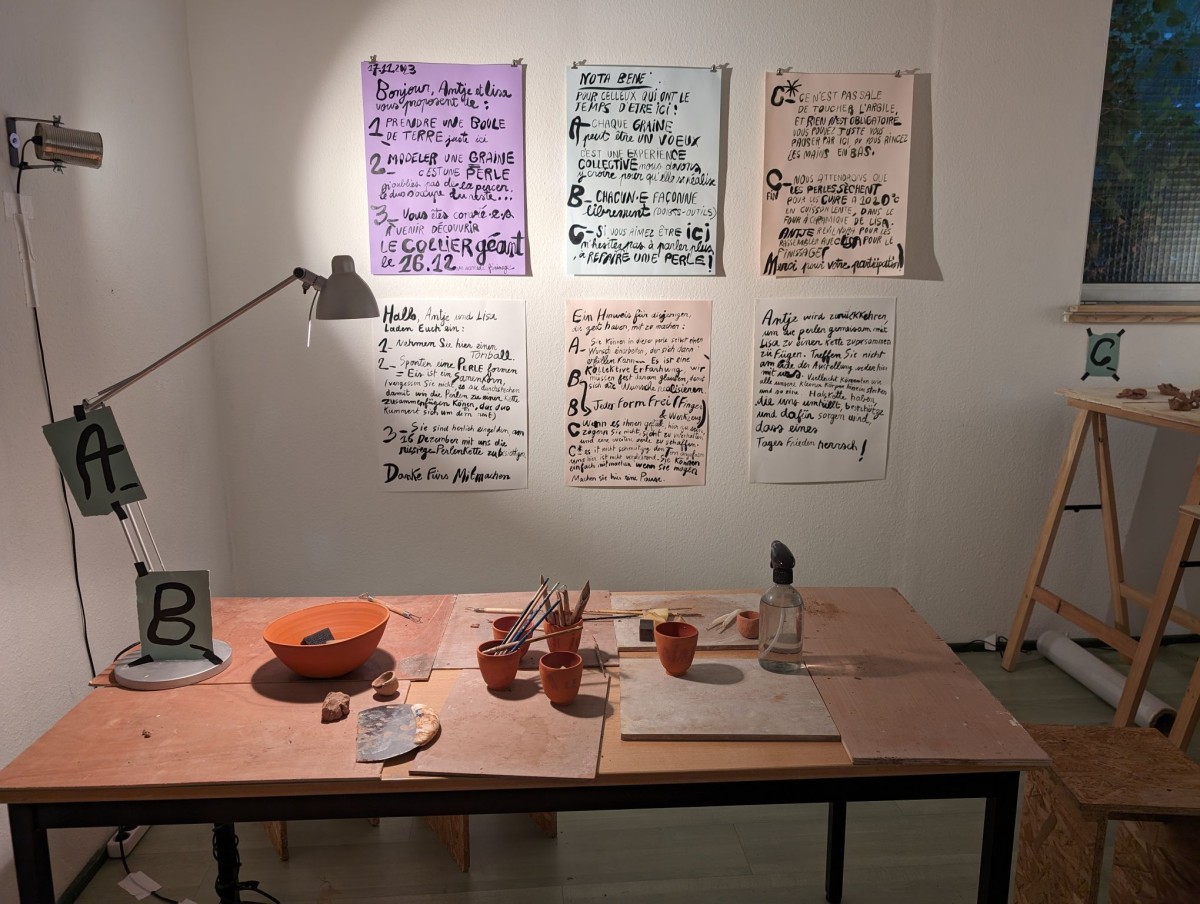 Collaborative/interactive installation, various dimensions, paper, ink handwriting in french and german, water, Bollène clay, plastic, wood, lighting, tape, printing. furniture.