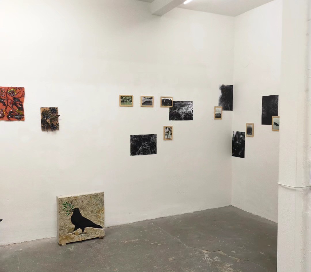 Vue installation d’ensemble pièces personnelles et pièces de Antje Bessau (brins d'herbe en terre, en taille de pierre) AlterShlatschof. Vue d'exposition Luis Leu Galerie Karlsruhe - Février 2024 aux cotés du Corbeau de Antje Bessau et des photographies de Viola Korosi. Une exposition Correspondanz Team 2023.