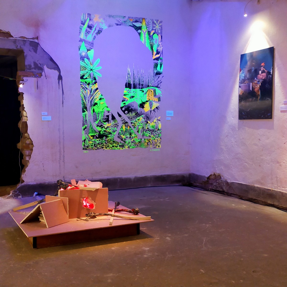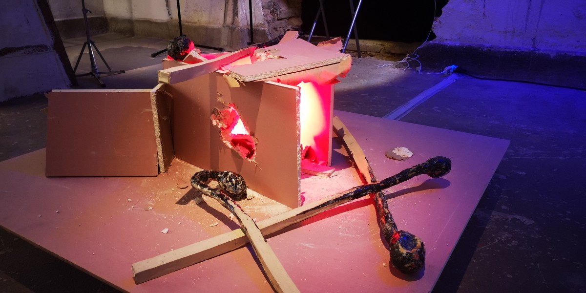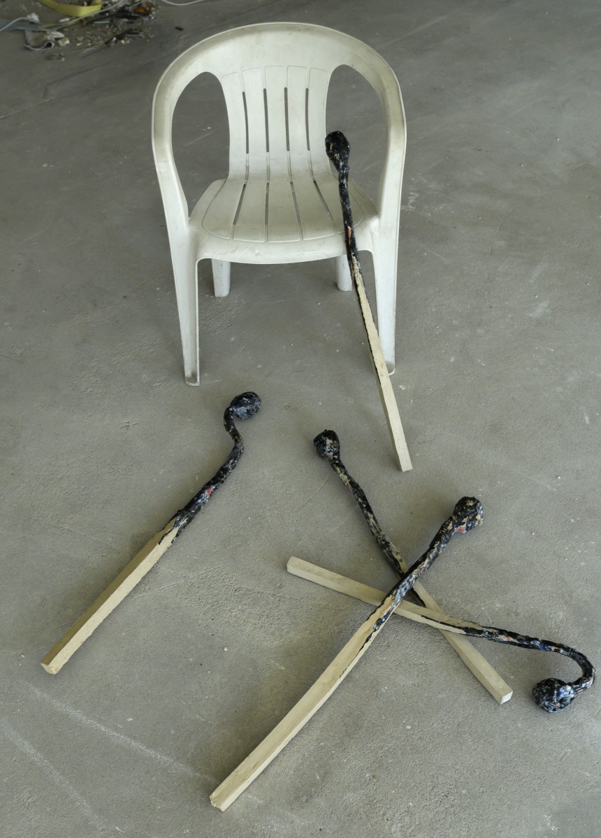 Grès coloré, émaillé haute température; 20 x 15 x 90cm max l'allumette, Installation à dimension variable, placoplâtre inhifugé, lumière rouge. Le peuplier est utilisé pour la fabrication de l'allumette, il provient de la «populi culture». «C’est Normal» est un pied de nez étrange, lucide. titre directement inspiré de la musique de Brigitte Fontaine et Areski.