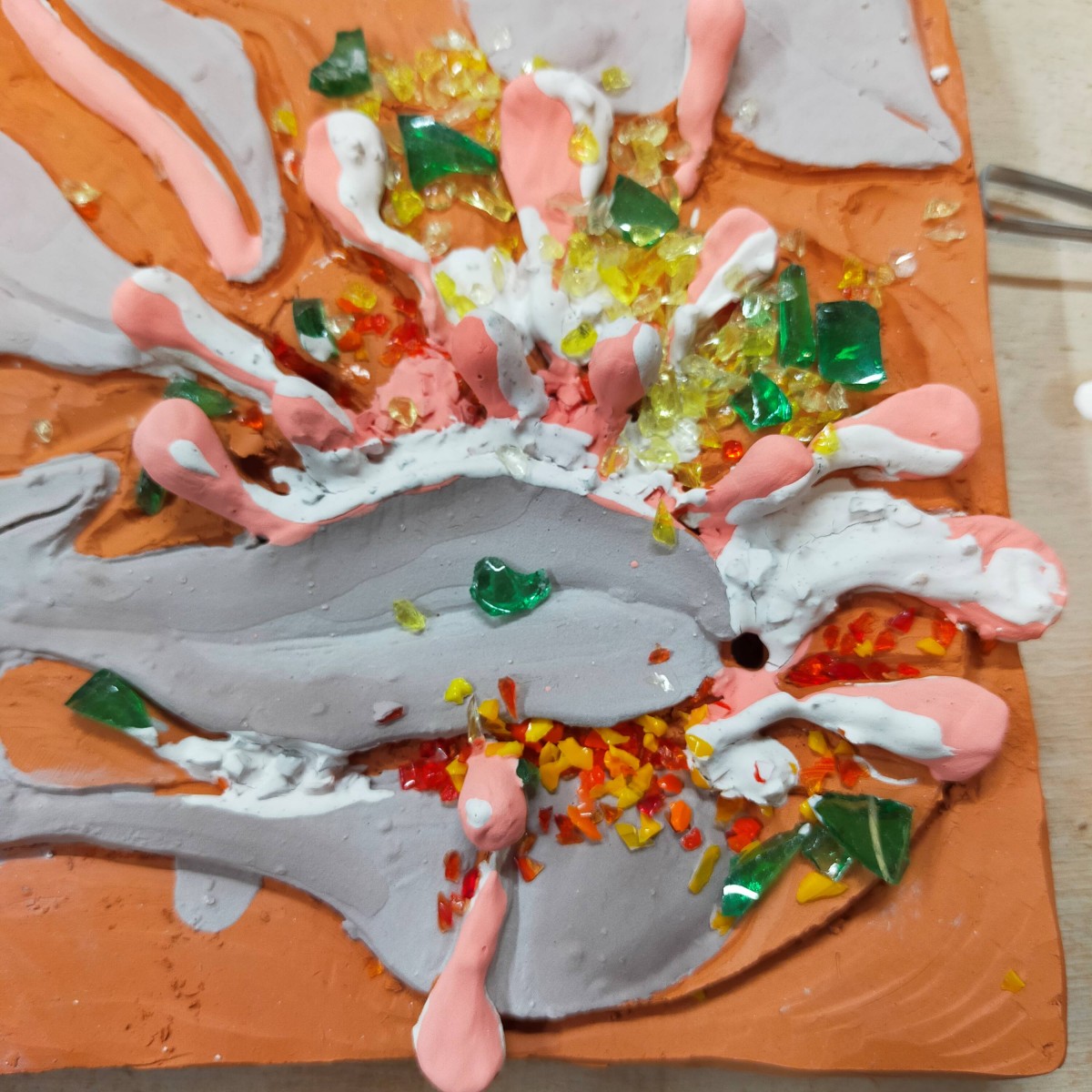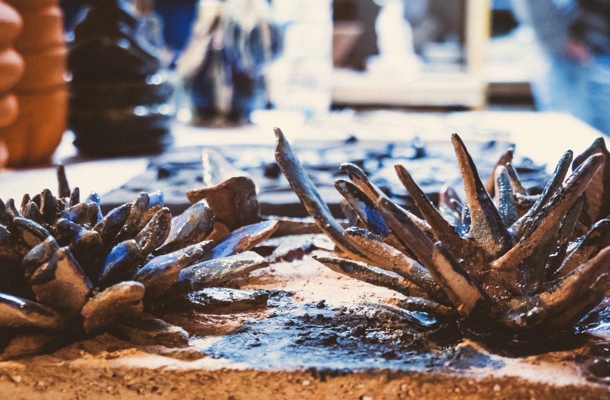 Hautes et basses températures électrique et verres de bouteille de bière météor, verre de Murano. Argiles venues du nord de la france et Grès réfractaire de Bollène (village de potier sur les terres de ma grand mère, PACA) et premières taille de pierres en provenance d’Allemagne, principalement locales. Sable et calcaire d’allemagne, des couleurs régionales.