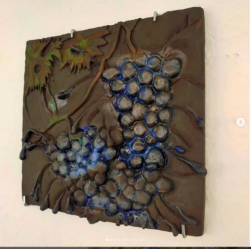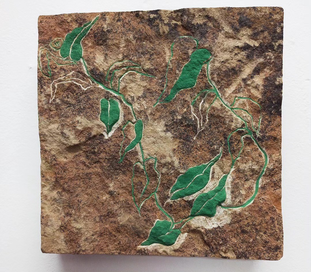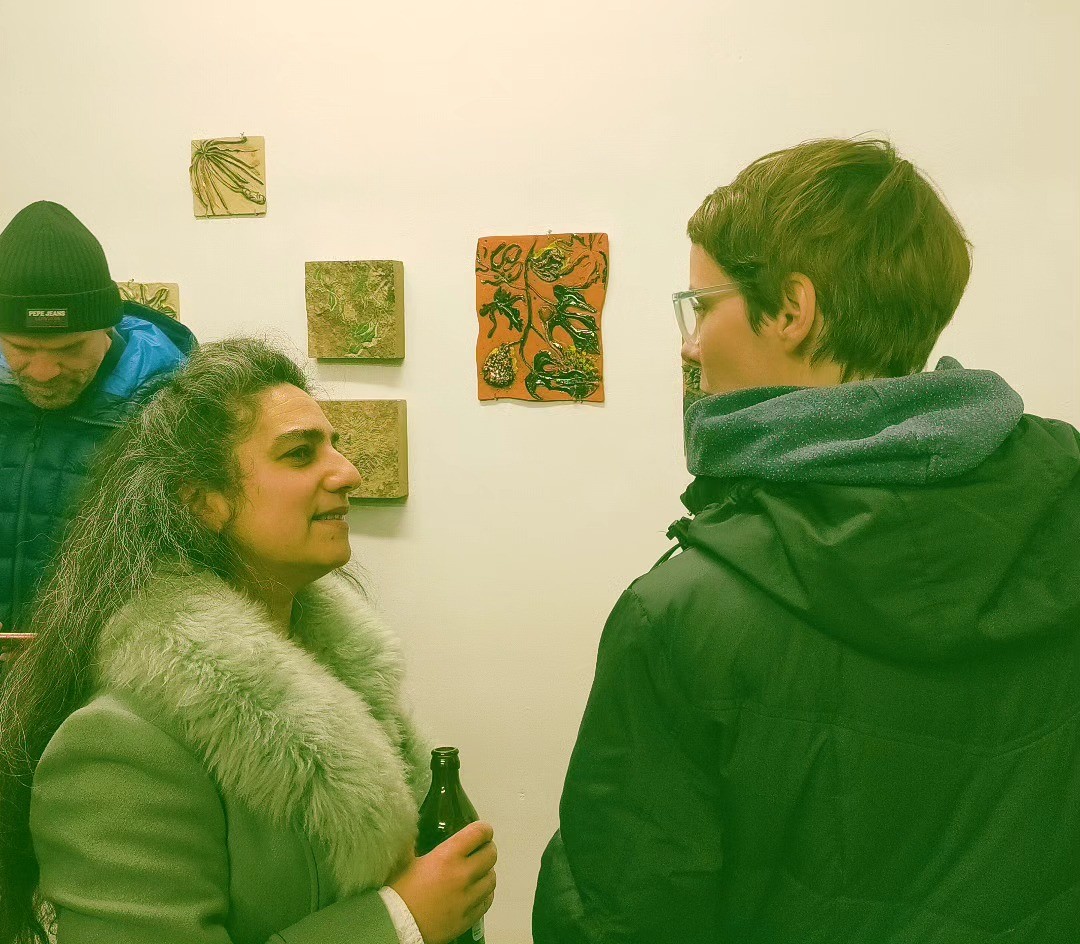 Vue installation d’ensemble pièces personnelles et pièces de Antje Bessau (brins d'herbe en terre, en taille de pierre) AlterShlatschof. Vue d'exposition Luis Leu Galerie Karlsruhe - Février 2024 aux cotés du Corbeau de Antje Bessau et des photographies de Viola Korosi. Une exposition Correspondanz Team 2023.