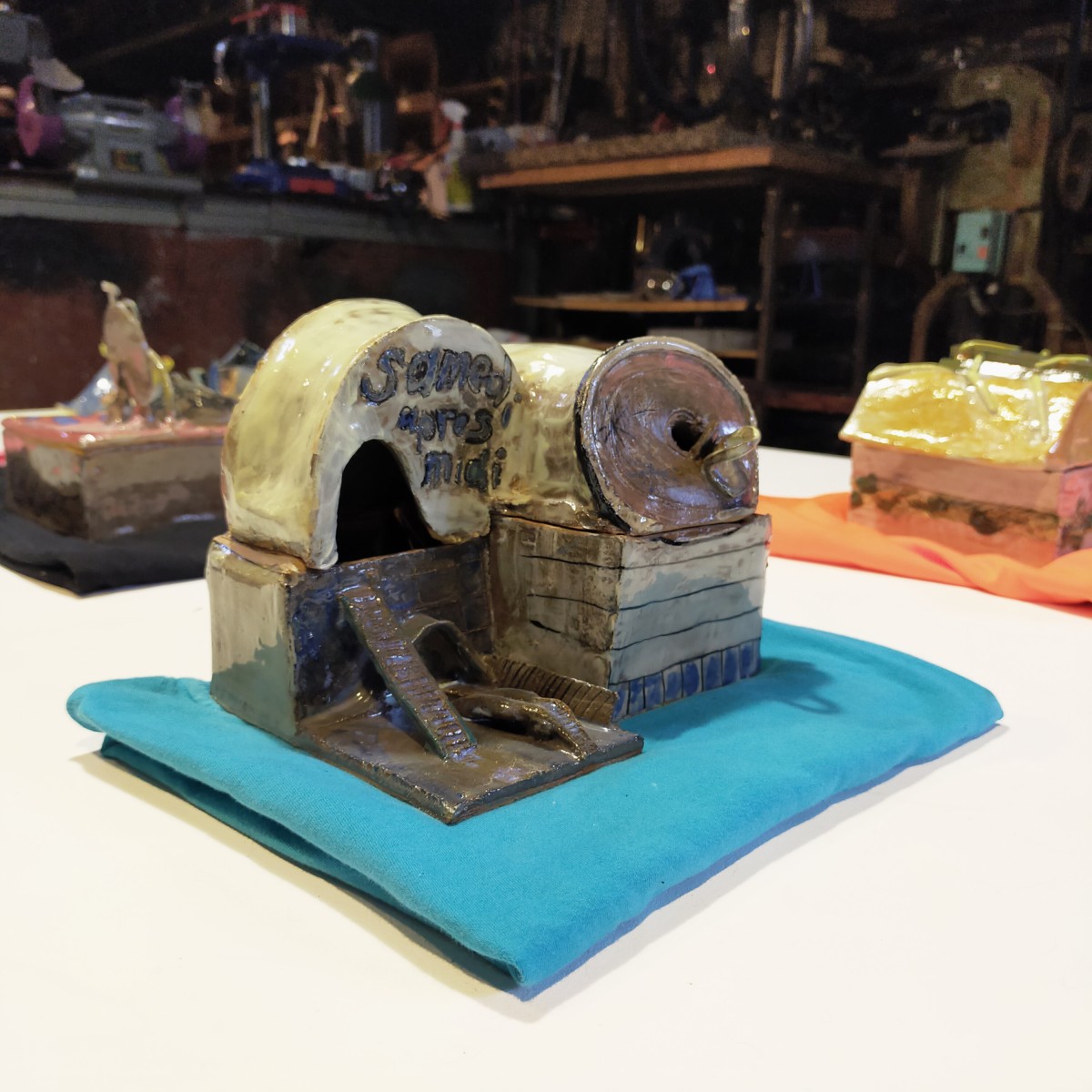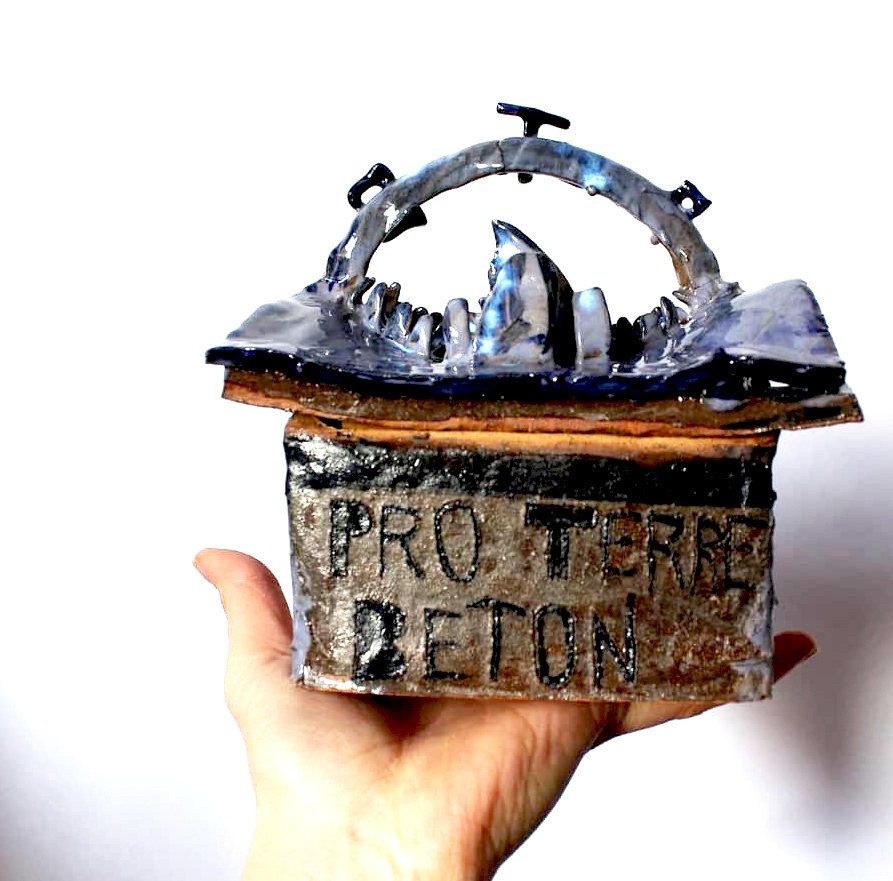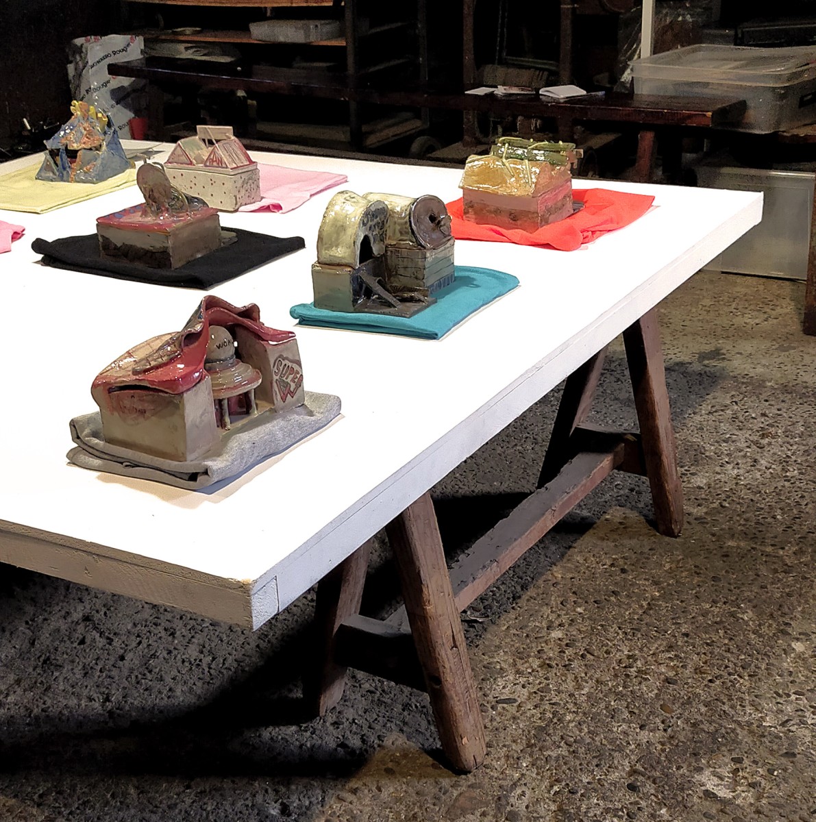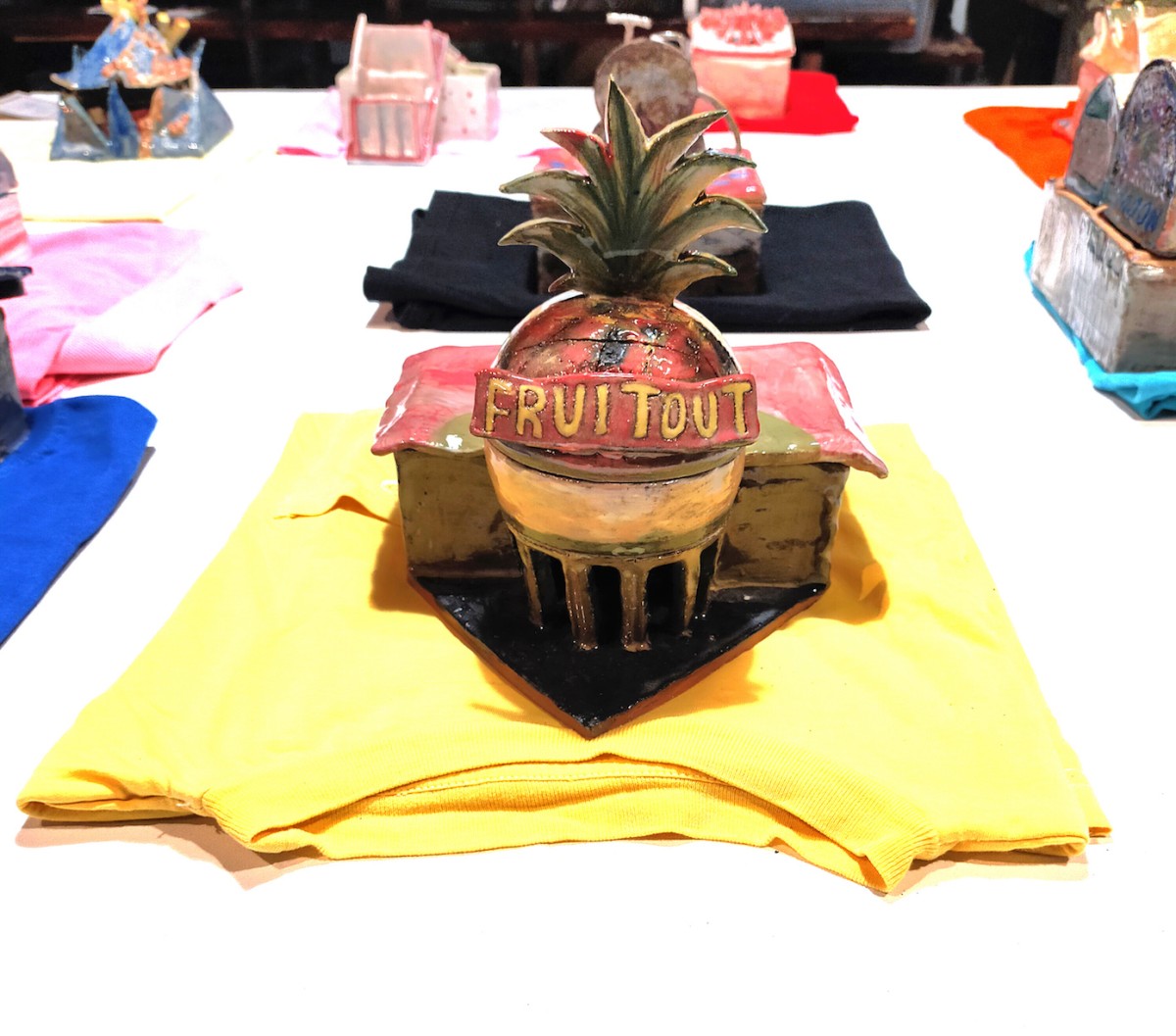 2020, «Petits centre commerciaux boîtes», 12 pièces, en continu, céramique émaillé haute température, Tee-shirts seconde main, dimensions variables, maximum, 30 x 30 x 19 cm la boite sculpture sur tee-shirt Vue d’installation au salon Small is beautiful du Non-Lieu à Roubaix
