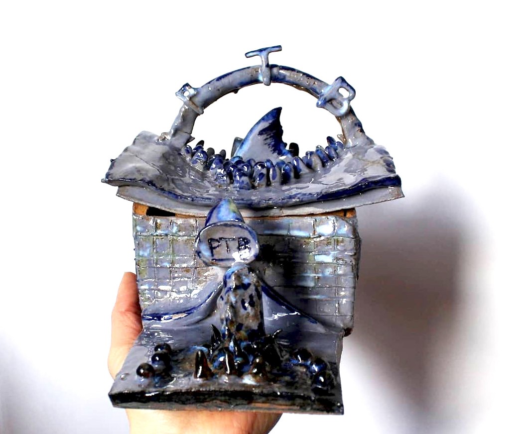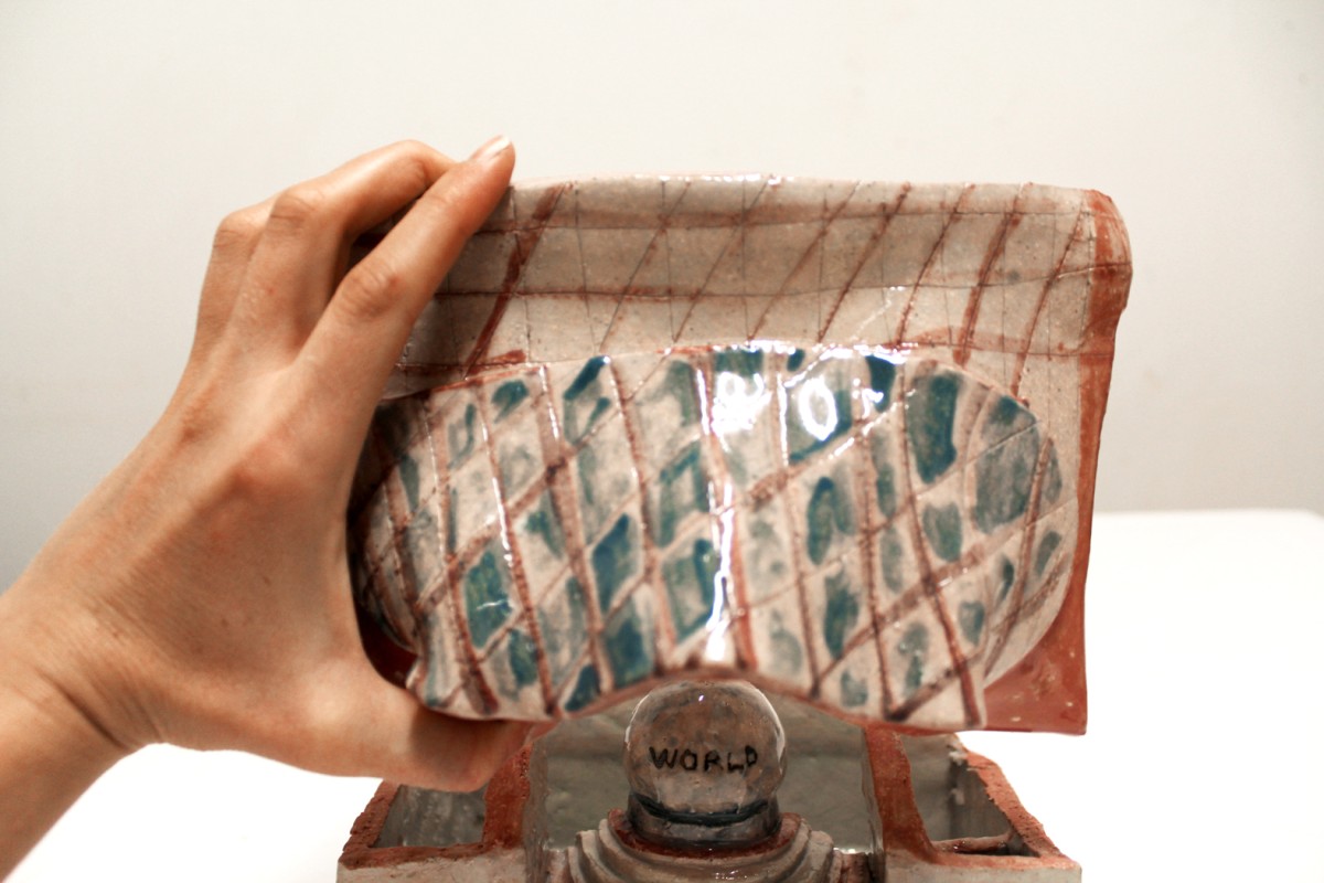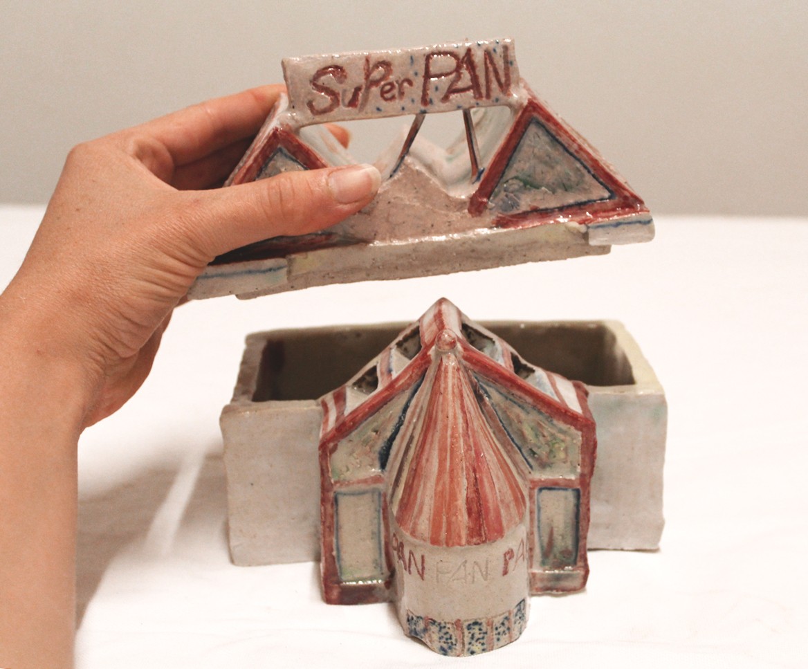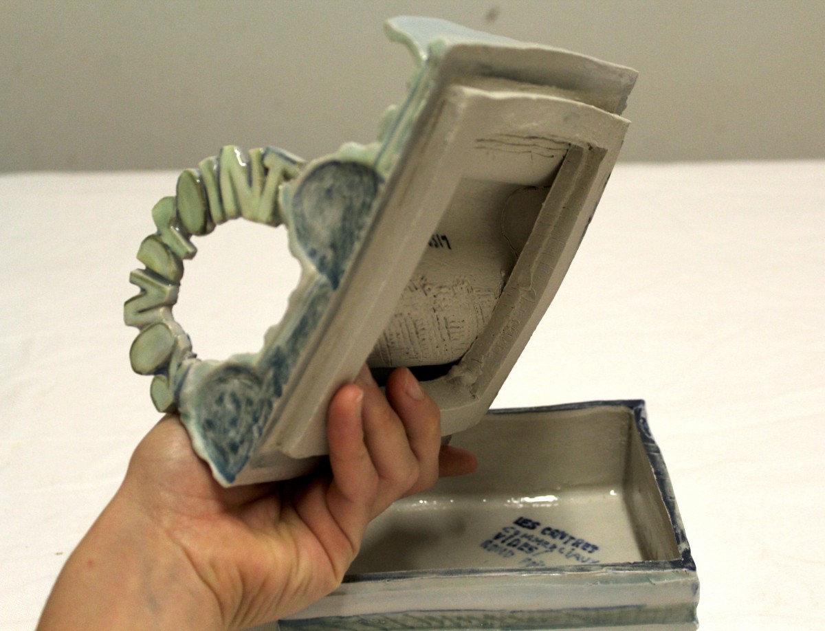 2020, «Petits centre commerciaux boîtes», 12 pièces, en continu, céramique émaillé haute température, Tee-shirts seconde main, dimensions variables, maximum, 30 x 30 x 19 cm la boite sculpture sur tee-shirt Vue d’installation au salon Small is beautiful du Non-Lieu à Roubaix